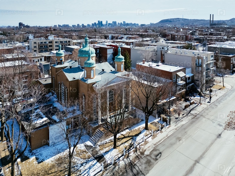 Вид с воздуха Святой Марии, Покровительницы Украинской Православной Церкви в Монреале в ясный зимний день