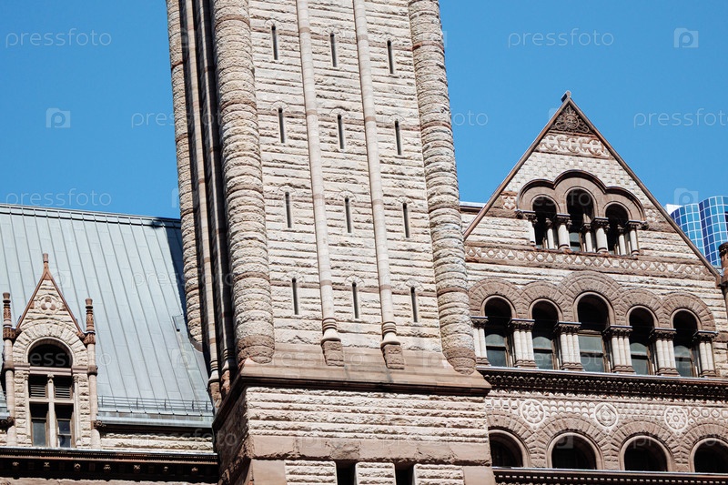 Историческая Часовая башня Старого городского собора обрамлена современными небоскребами в центре Торонто в яркий, ясный день