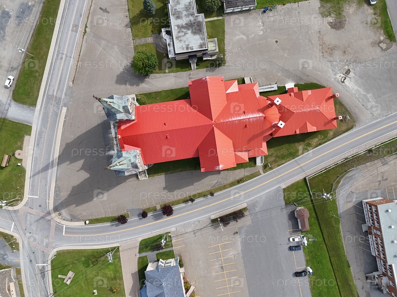 Вид с воздуха на католическую церковь Святой Анны недалеко от Сен-Анне де Монтс в Квебеке, где есть дома и горы