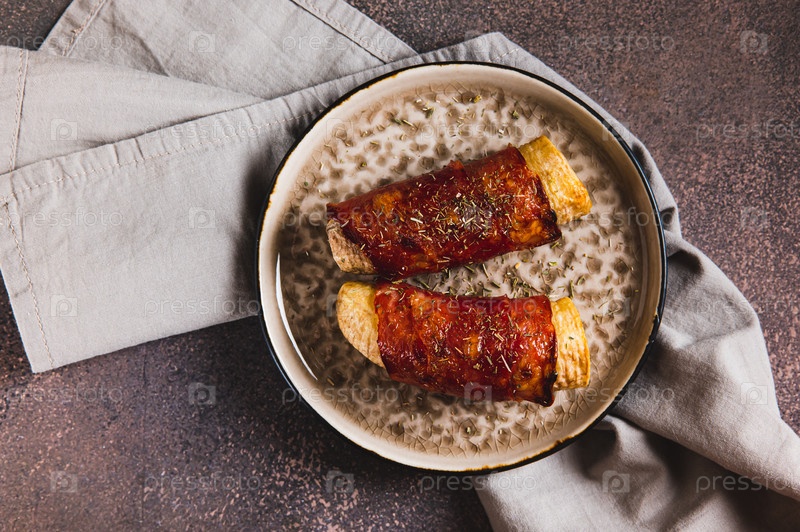 Выпеченный банан, завернутый в бекон на тарелке на столе