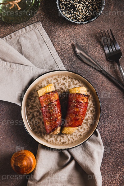 Выпеченный банан, завернутый в бекон на тарелке на столе