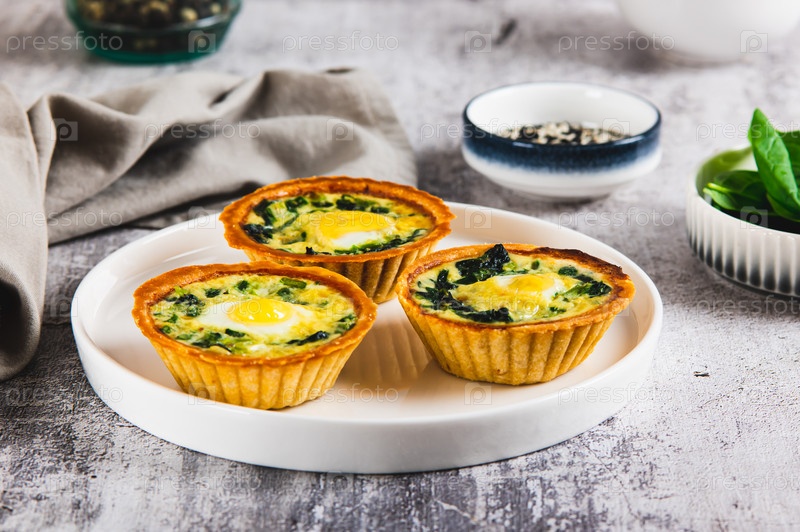 Выпеченные пироги с перепельными яйцами и свежим шпинатом на тарелке на столе