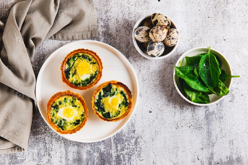 Выпеченные пироги с перепельными яйцами и свежим шпинатом на тарелке на столе