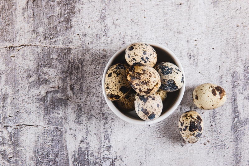 Свежие неочищенные перепелиные яйца в миске и на столе