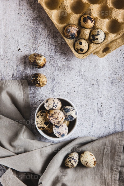 Свежие неочищенные перепелиные яйца в миске и на столе
