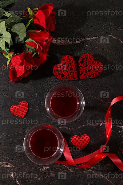 Два бокала красного вина на праздничном столе с розами, сердцами и лентой. Концепция Дня святого Валентина, реклама бара и кафе. Баннер для приглашения в праздничный буфет, открытка к свадьбе
