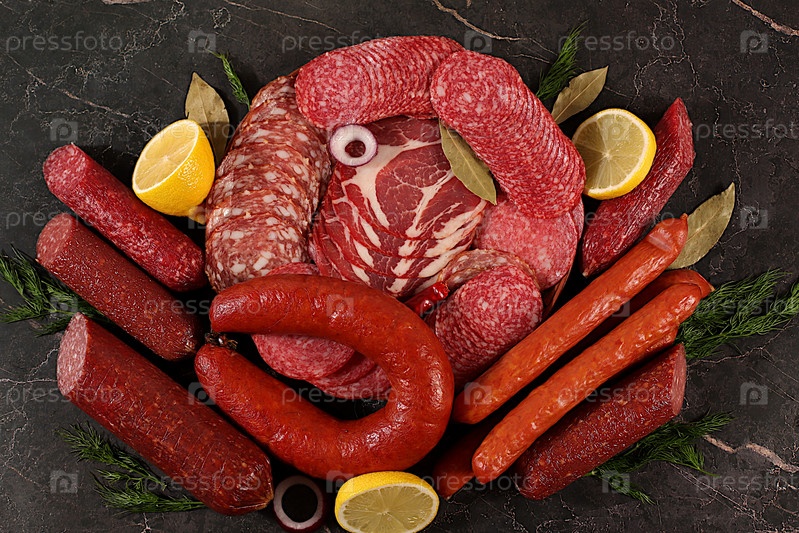 Вкусные, ароматные закуски из различных колбас для праздников. Выбор копчённых и сушеных сосисок и специй на фоне кухни. Реклама магазина и меню