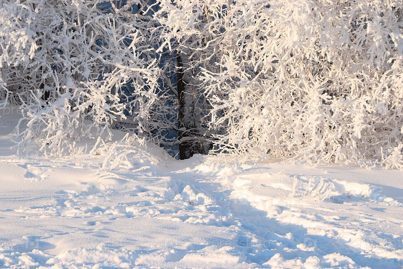 Зимний пейзаж в центральной России. Великолепные красивые деревья в толстом слое морозов и снег во время сильных заморозков. Красивая зимняя пригласительная карточка для туристов