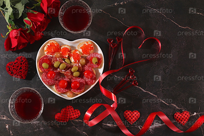 Удовольствие на День святого Валентина, сердце свежих каннапесов с салями, икры, сыра и винограда для буфета с розами, красное вино, красные сердца для праздничного стола, баннер для рекламы, приглашения в бар