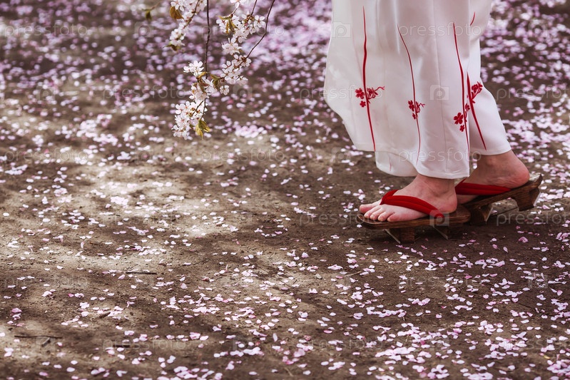 Ноги женщин в традиционной японской обуви гата окружены упавшими лепестками вишни.Портрет символизирует традиции и культуру японского народа