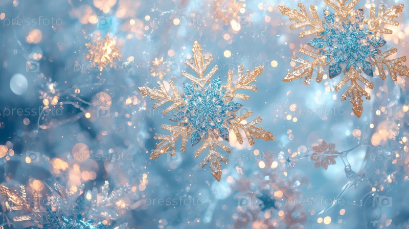 Золотые снежинки на синем блестящем фоне