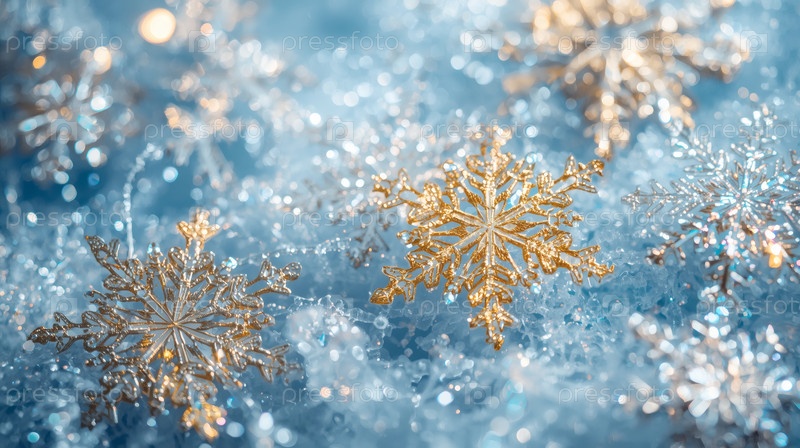 Золотые снежинки на синем блестящем фоне