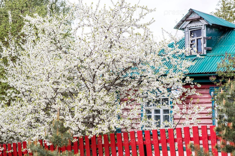 Русская хижина или деревянный вырезанный дом на цветущих вишневых деревьях весной.Окна с красивыми резными рамами, русская культура