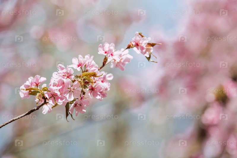 Цветы на ветвях деревьев в японском парке. Розовая вишня в цветении. Весна здесь и природа оживает. Японские вишневые цветы в весеннем саду