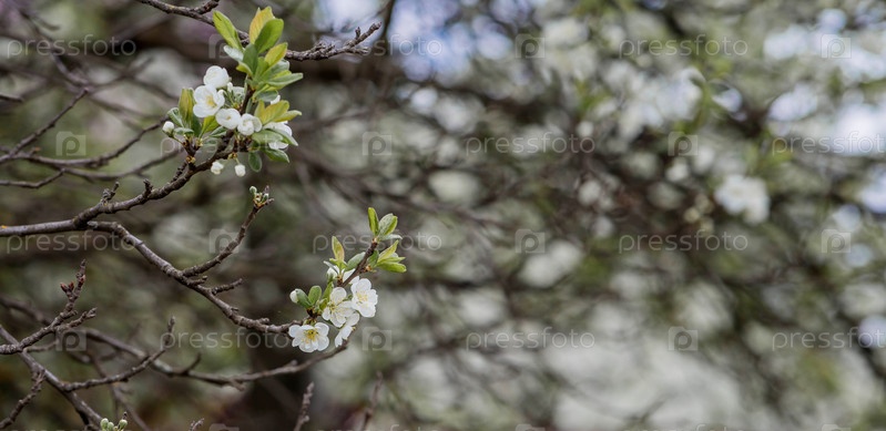 Цветение сливы в саду. Белые цветы распускаются на ветвях дерева. Макрофотография. Весенние обои, природа. Размытый фон. Баннер