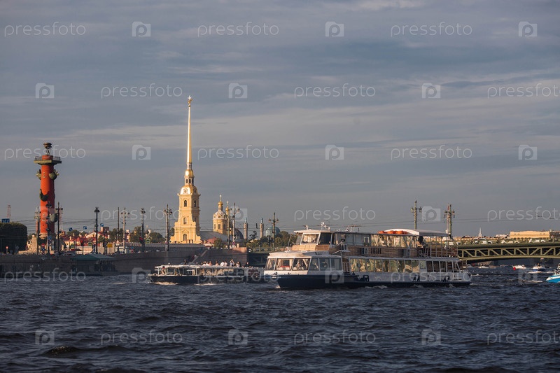 Вид на Васильевский пролив, Ростральную колонну и крепость Петра и Павла на Василиевском проливе. Россия, Санкт-Петербург, 15 августа 2025