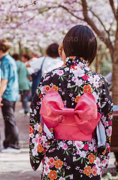 Портрет символизирует традиции и культуру японского народа.Женщина в японской одежде с зонтиком в руке во время цветения вишни весной