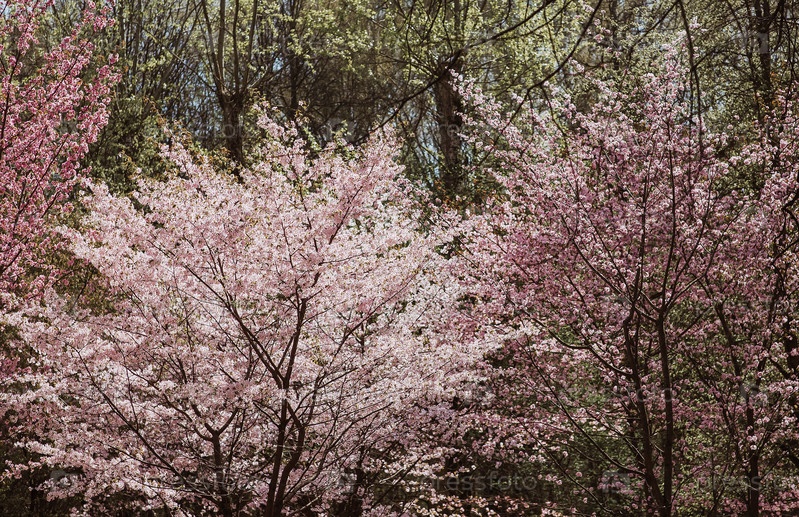 Цветы на ветвях деревьев в японском парке. Розовая вишня, цветущая. Наступила весна и природа оживает. Японские вишневые цветки в весеннем саду