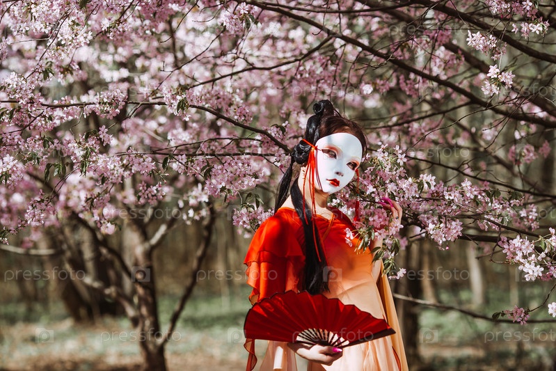 Портрет символизирует традиции и культуру японского народа.Женщина в японской маске, традиционная одежда, с ветряком в руке, окружена вишнями