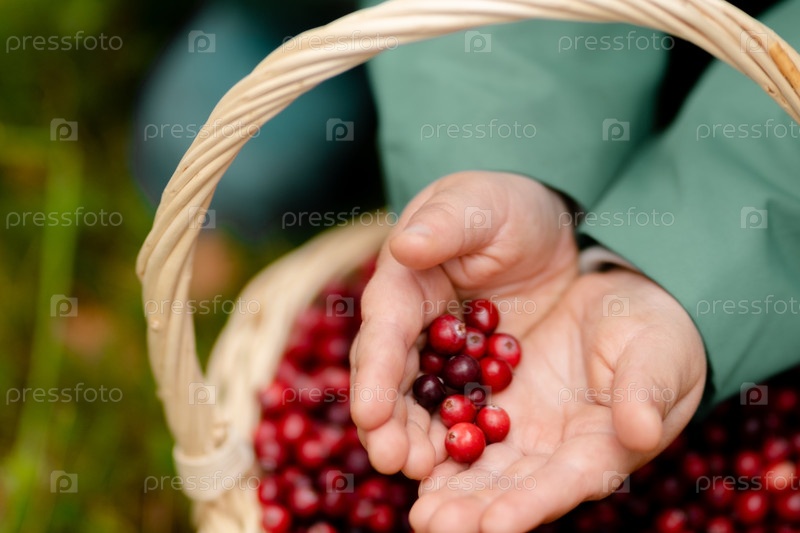 Кранберри в руках у ребенка. осенняя природа