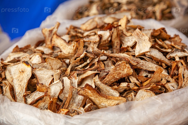 На деревенской ярмарке в упаковке было много сушеных грибов