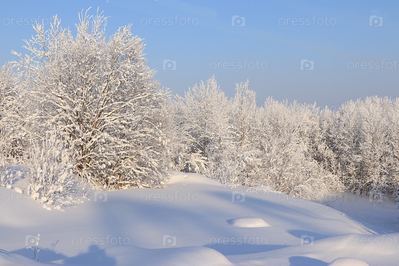 Русская зима, после снегопада ветви деревьев покрыты снегом и блестят на солнце, снег дрейфует вниз до колена, вне дороги