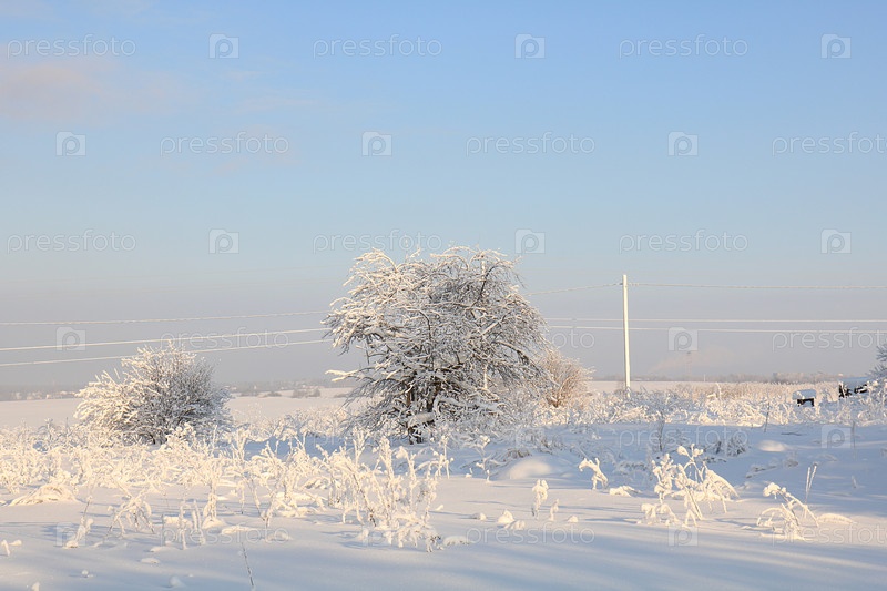После снегопада ветви деревьев покрыты снегом и блестят на солнце, сильные морозы и низкие температуры
