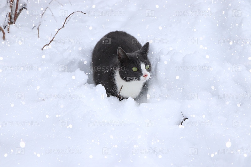 Домашний питомец впервые увидел снег и развлекает, зимний фон, селективный фокус