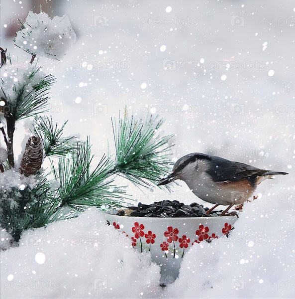 Зимняя карточка, красивый снежный фон с концепцией помощи птицам в суровых зимних морозах