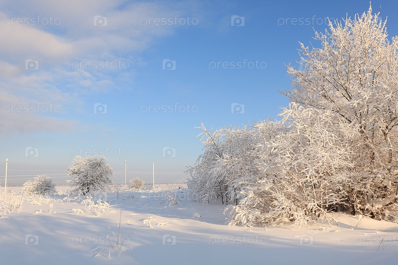 После снегопада ветви деревьев покрыты снегом и блестят на солнце, сильные морозы и низкие температуры