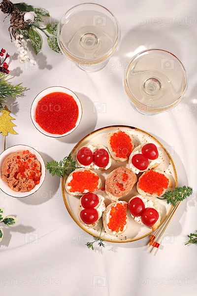 Французский багет с паштетом от копченого лосося, красной икры, мягкого сыра и помидоров, концепция на канун Рождества, меню ресторана и кафе. рождественские и новогодние блюда, комплект каннапе для праздничного стола