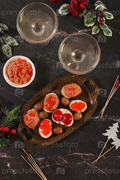 Французские багетты из пасте и икры, копченого лосося, мягкого сыра и помидоров, блюда на Рождество и Новый год, комплект закусок и освежающих напитков для праздничного стола и буфета