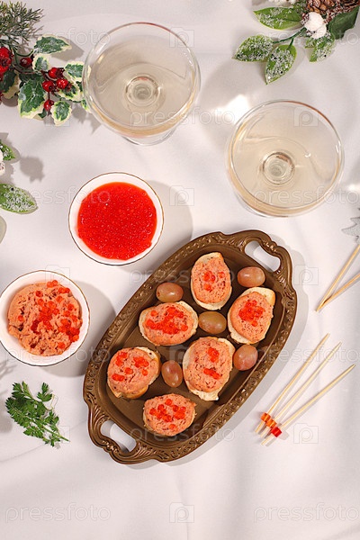 Рождественские и новогодние блюда, выбор закусок и напитков для праздничных столов и буфетов. Блюда с пастой, багетом и икры, копченым лососем, мягким сыром и помидорами