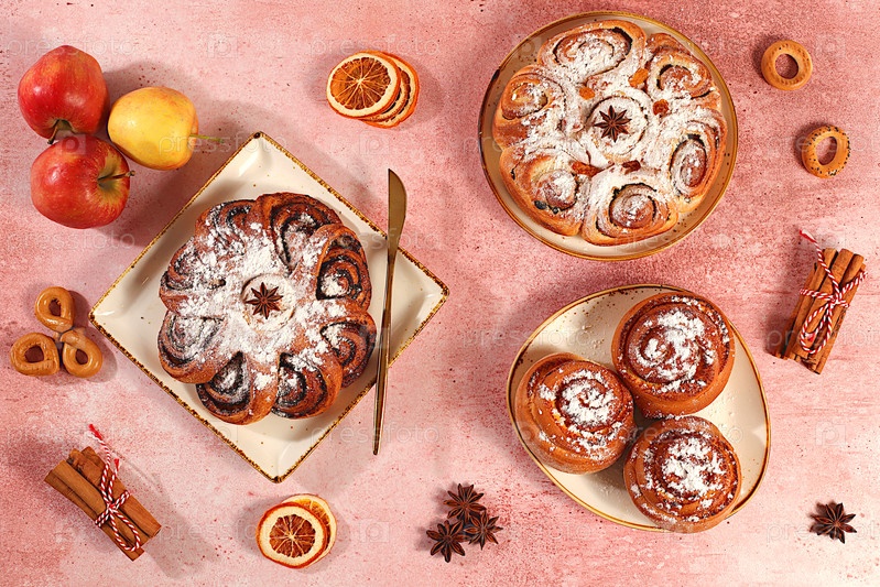 Яблочные пироги, булочки, кексы с яблоками, корицей, маком, клюквами и ликером из яйца. Домашний вкусный десерт. Баннер праздничной кухни. Концепция праздничного выпекания, сезонные лакомства