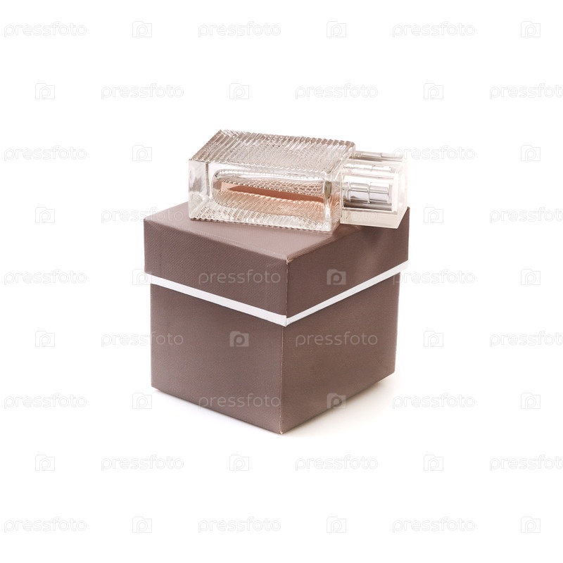 Изолированное на белом фоне изображение бутылки и коробки с парфюмом