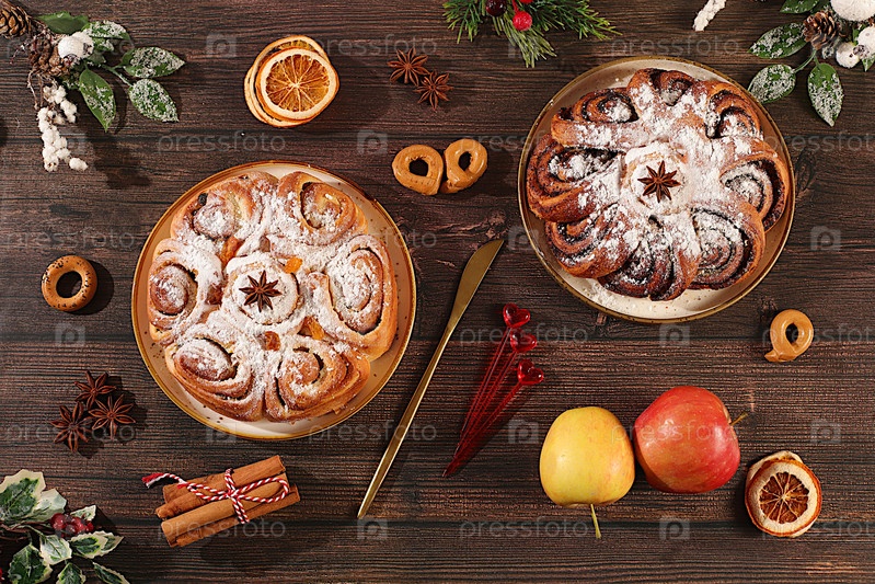 Яблочные пироги и кексы с орехами, корицей, маковыми семенами, клюквами и ликером из яиц. Домашний зимний десерт, кухонный баннер. Концепция праздничной выпечки,