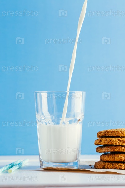 Стакан молока и печенье на синем фоне