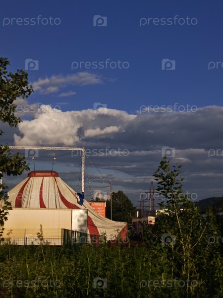 Яркий летний день с красно-белой цирковой палаткой под обширным голубым небом в оживленном окружении на открытом воздухе