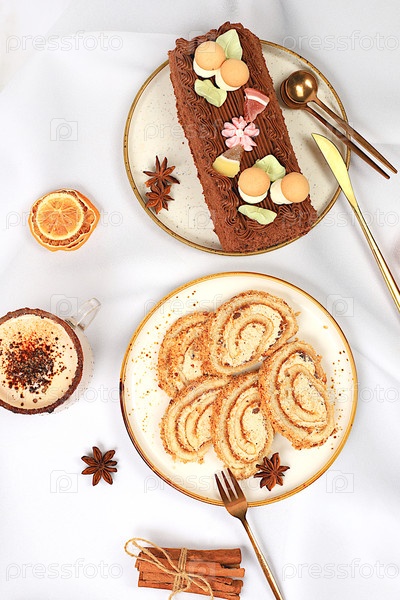 Баннер праздничной кухни. Концепция праздничного выпекания, сезонных лакомств и рекламные кафе, меню ресторанов. Домашний зимний десерт, тален, рулоны или штрудель со сладким сливочным наполнением, орехи, корица, клюквы и маковые семена, а также яйцо