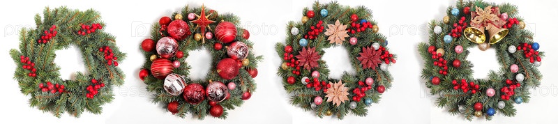 Баннер с рождественскими венками из живых ветвей елей, игрушек, снежин и ювелирных украшений. Дизайн шаблона и макета для праздничной рекламы. Красивый праздничный фон накануне Рождества