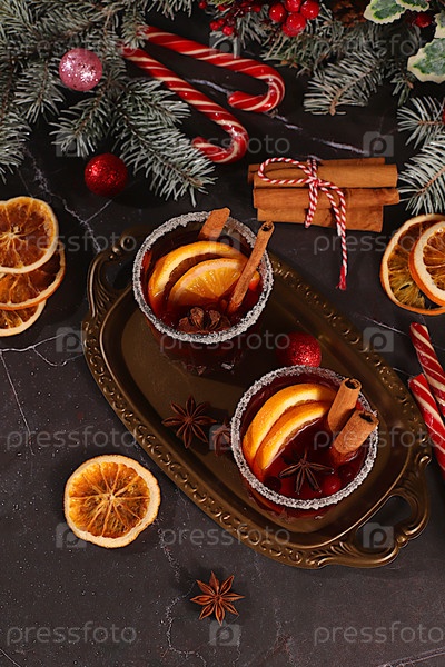 Сильный алкогольный или безалкогольный коктейль, горячее вино с специями, звездный анис, клюквенная ягода, апельсин, яблоко и корица, нагрев зимнего напитка в холодный сезон, рождественский праздничный грок,