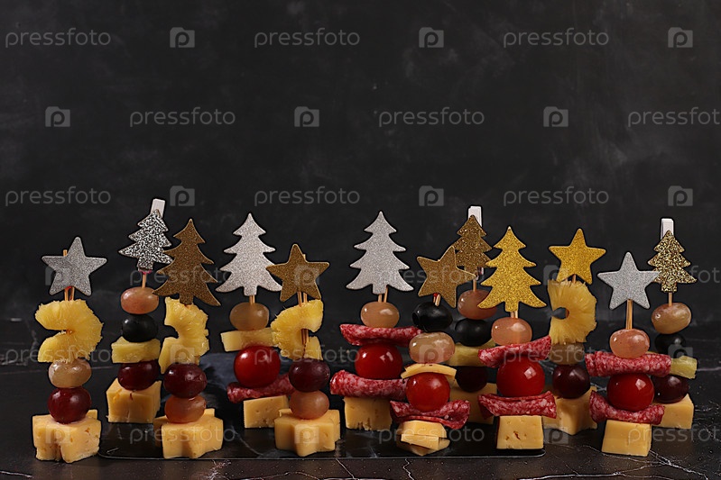 Диета с помидорами, сыром моцареллой, саламом, ананасом, оливками и виноградом на мраморном столе. рождественские и новогодние блюда, комплект закусок для праздничного стола