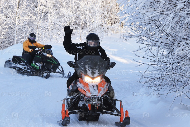 Зимние виды спорта на открытом воздухе в России.На фото спортсмены на снегоходах ездят по заснеженной внедорожке в дикой, непроходимой местности на фоне красивого зимнего пейзажа с деревьями, покрытыми морозом