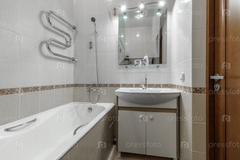 Чистый интерьер ванной комнаты с ванной, раковина шкаф, настенное зеркало со светом и черепичные стены