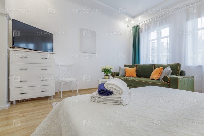 Яркая уютная комната с зеленым диваном, свежими сложенными полотенцами на кровати и мягким естественным освещением