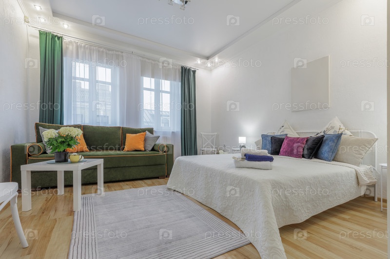 Просторная яркая спальня с уютным диваном, мягким постельным бельем, декоративными подушками и естественным светом, создавая спокойную и гостеприимную атмосферу