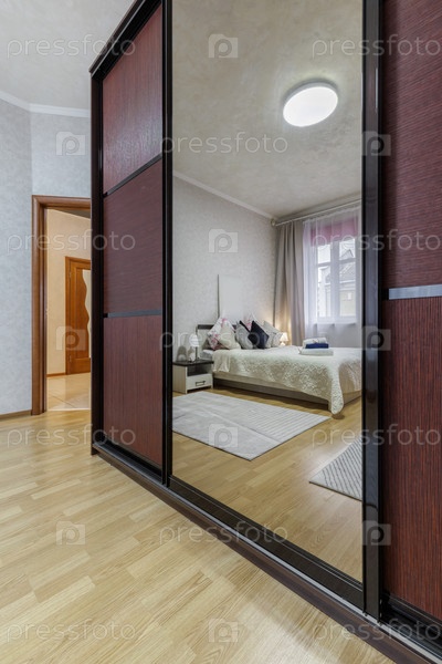 Интерьер спальни отражается в большом зеркальном шкафу, показывающем уютную кровать, мягкое освещение и свет нейтральный декор