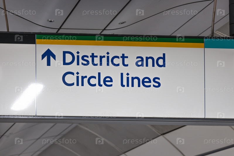 Прямая вывеска для линий District и Circle на станции лондонского метро. белые знаки с синим текстом и цветные линейные индикаторы