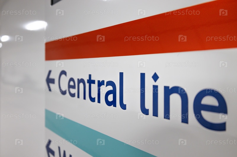 Закройте вид на знак Центральной линии в сети лондонского метро, изображающий знаковую красную полосу и синюю типографию