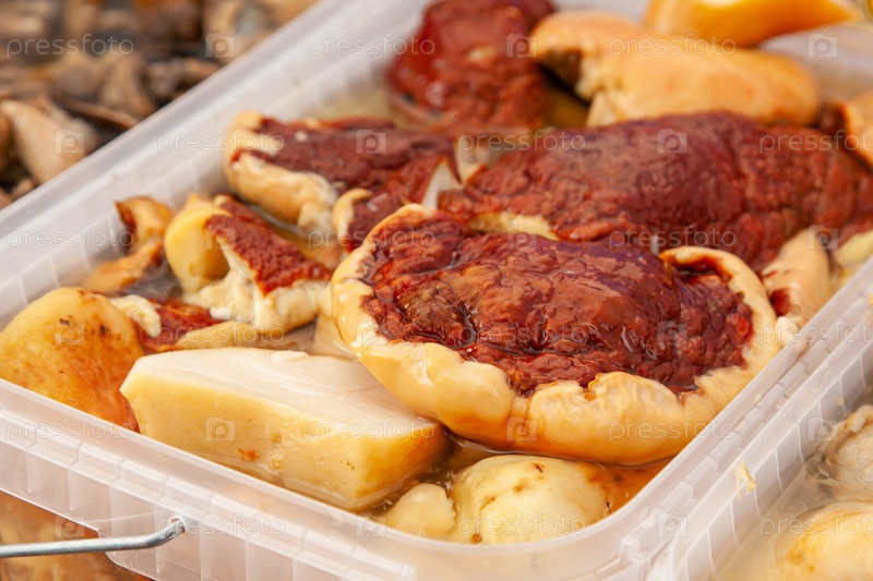 Очищенные грибы мотороллер в пластиковом ведрах на российской сельской ярмарке
